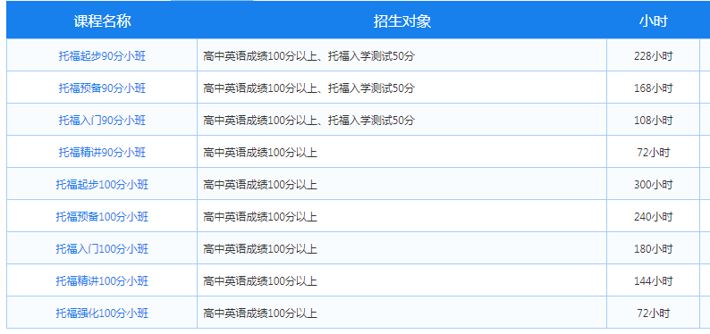 托福起步90分小班、托福预备90分小班、托福入门90分小班、托福精品90分小班、托福起步100分小班、托福预备100分小班、托福入门100分小班、托福精品100分小班、托福强化100分小班、托福写作单项班、托福口语单项班、托福听力单项班。