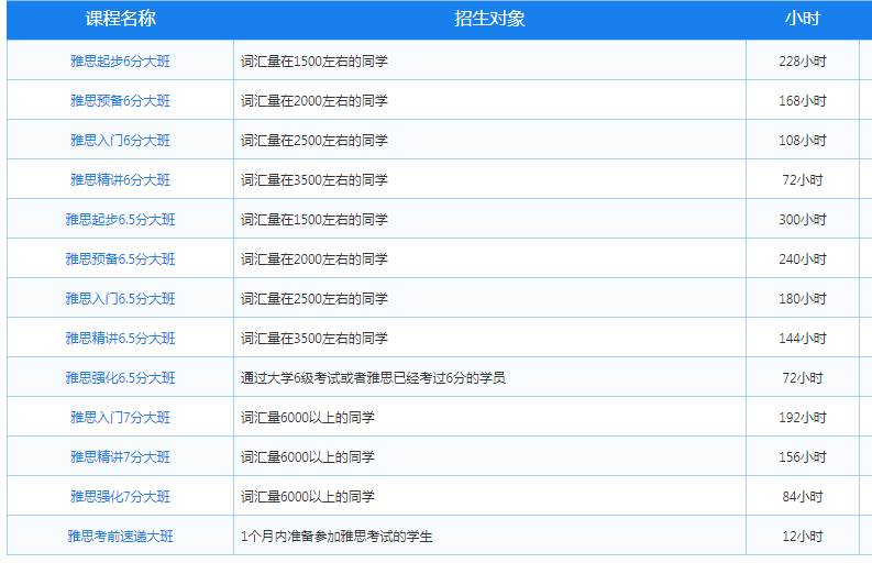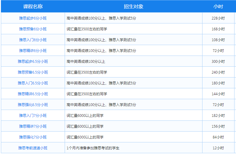雅思起步6分小班、雅思预备6分小班、雅思入门6分小班、雅思精品6分小班、雅思起步6.5分小班、雅思预备6.5分小班、雅思入门6.5分小班、雅思精品6.5分小班、雅思强化6.5分小班、雅思入门7分小班、雅思精品7分小班、雅思强化7分小班、雅思考前速递小班、雅思写作单项班、雅思口语单项班。